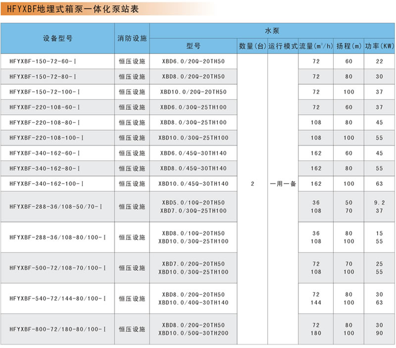 隨著現(xiàn)代化城市的迅速發(fā)展,高層建筑的日新月異,高位水塔已經(jīng)不能滿足高層建筑 的供水要求,在這種條件下,自動化供水設(shè)備發(fā)展迅速,主要有變頻恒壓供水設(shè)備、管網(wǎng)疊壓無負(fù)壓供水設(shè)備和箱泵一 體化泵站三種。 富亞公司生產(chǎn)的地埋式箱泵一體化消防泵站,是根據(jù)公安部標(biāo)準(zhǔn)GB 27898.2-2011《消防自動恒 壓給水設(shè)備》和國標(biāo)02S101圖集設(shè)計的新型消防專用固定滅火裝置。設(shè)備主要由不銹鋼消防水箱/熱鍍鋅鋼板水箱/SMC水 箱,消防增壓泵、穩(wěn)壓泵,氣壓罐,控制柜,傳感器,儀表,管道附件等組成;是取代混凝土消防水池的理想產(chǎn)品,可 節(jié)約投資30%以上。廣泛適用于多層建筑、高層建筑和廠礦企業(yè)等有消防增壓設(shè)計要求的消火栓系統(tǒng)及噴淋系統(tǒng)等各類消 防給水系統(tǒng)。 它是綜合了變頻恒壓供水設(shè)備和管網(wǎng)疊壓無負(fù)壓供水設(shè)備的的優(yōu)點(diǎn),是根據(jù)自來水管網(wǎng)壓力反饋 ,將設(shè)備的進(jìn)水水源智能變換,自來水服務(wù)壓力很高或者用水低峰時,它就會自動將設(shè)備進(jìn)水源的電動閥打開,水箱供 水電動閥關(guān)閉;當(dāng)用水高峰時,它就會自動關(guān)閉自來水進(jìn)水電動閥,并打開水箱供水電動閥,此時它又變?yōu)榱藗鹘y(tǒng)的變 頻恒壓供水設(shè)備。絕不會減少自來水管網(wǎng)的服務(wù)壓力。